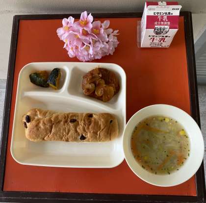 今日の献立は、煮込みハンバーグ、コーンとキャベツのスープ、焼きかぼちゃ、レーズンパン、牛乳でした。