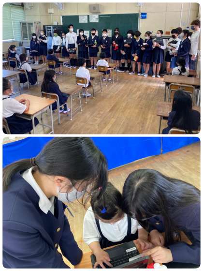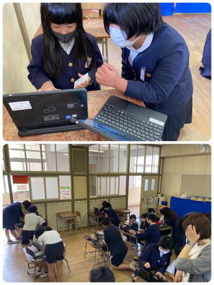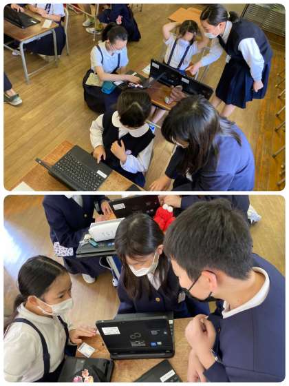 1時間目に6年生が、1・2年生にノートパソコンの使い方を教えに来てくれました。1年生はもちろん、2年生も昨年度まではタブレットを使っていたので初めてのノートパソコンです。6年生から、ID・パスワードを入れてログインする方法や、スクールライフノートの「心の天気」の使い方も教えてもらいました。早く終わった子は、カメラを使ったり、6年生がプログラミングで作ったゲームを楽しんだりしていました。さすが6年生!教え方がとても上手でした。