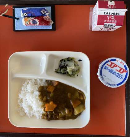 今日の献立は、牛肉と大豆のカレーライス、キャベツのひじきドレッシング、ヨーグルト、牛乳でした。