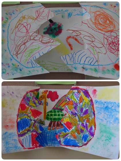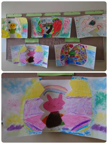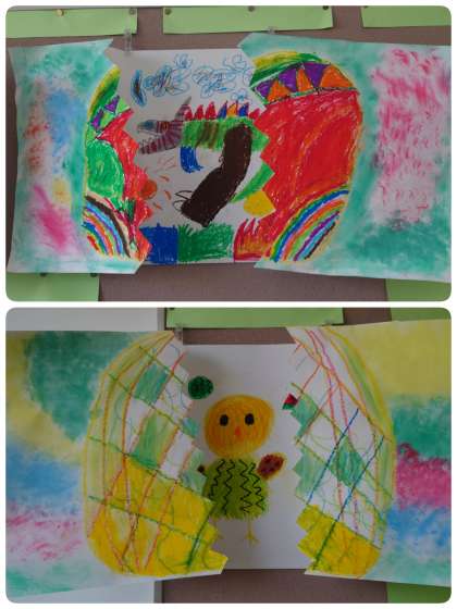 学習参観時に描いていた絵が完成しました。不思議なたまごの中から、いろんなものが誕生しました。たまごが立体的になっていて、なかなか完成度の高い作品になりました。