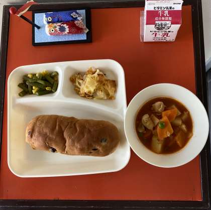 今日の献立は、ケチャップ煮、さんどまめとコーンのソテー、りんごのクラフティ、レーズンパン、牛乳でした。