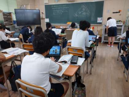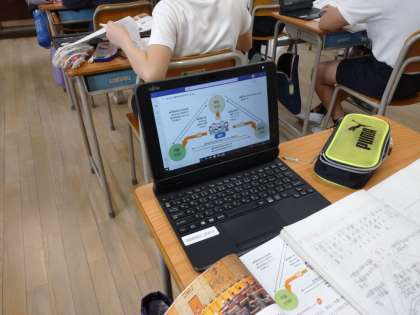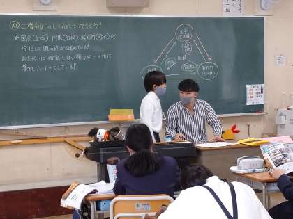 三権分立について、タブレットを使ってみんな熱心に調べています。