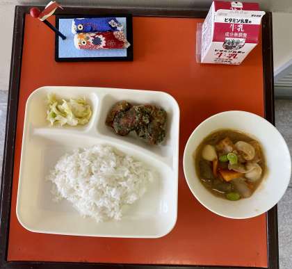 今日の献立は、ちくわのいそべあげ、あつあげとさといものみそ煮、あっさりキャベツ、ごはん、牛乳でした。
