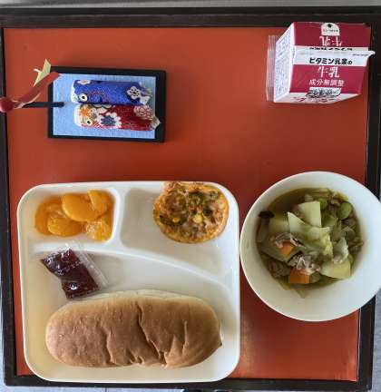 今日の献立は、豚肉と野菜のカレースープ煮、変わりピザ、みかん(かんづめ)、コッペパン、いちごジャム、牛乳でした。