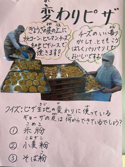 ピザ生地のかわりにギョーザの皮の上に、ツナ、ピーマン、コーン、チーズ、ピザソースを乗せて焼き物機で焼きます。子どもたちにとても人気があります。
