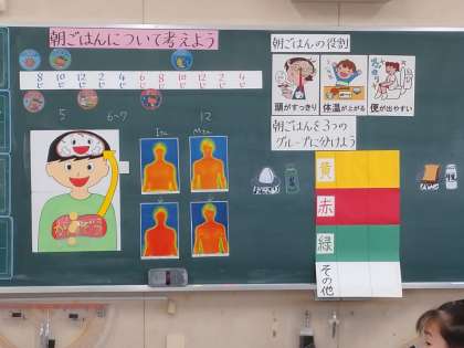 朝ごはんについて、色々意見を交わしながら栄養バランスの学習をしました。