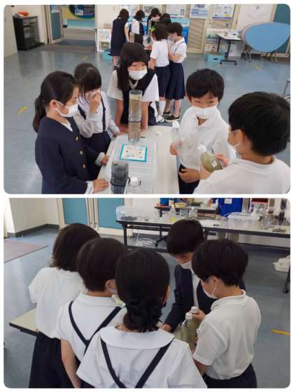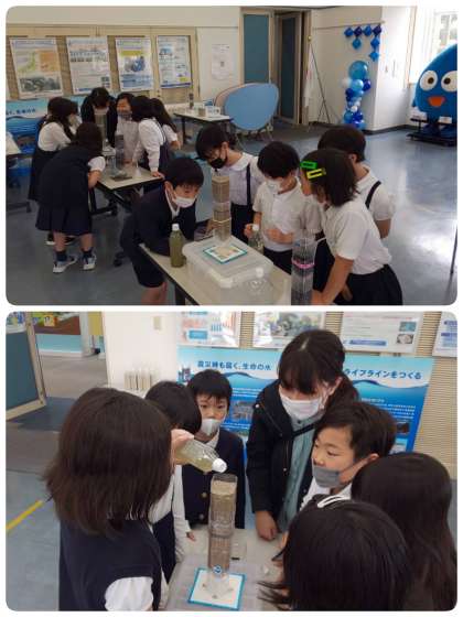 施設見学の後は、水の実験です。色のついた水をろ過すると透明になっていきます。子ども達はその変化を見てびっくりしていました。