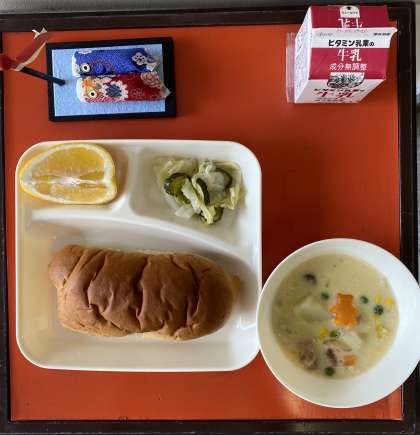 今日の献立は、コーンクリームシチュー、キャベツときゅうりのサラダ、かわちばんかん、黒糖パン、牛乳でした。