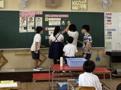 「朝ごはんを食べよう」という内容で、朝ごはんには3つのめざましスイッチ(頭・体・おなかのスイッチ)があること、黄・赤・緑の3色栄養をそろえることで1日が元気にスタートできることを学びました。