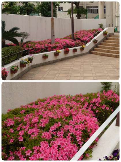 玄関の植え込みのツツジが満開になりました。色鮮やかでとてもきれいです。時々チョウもひらひらと飛んできます。きれいな花を見ると心が穏やかになりますね。