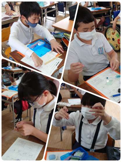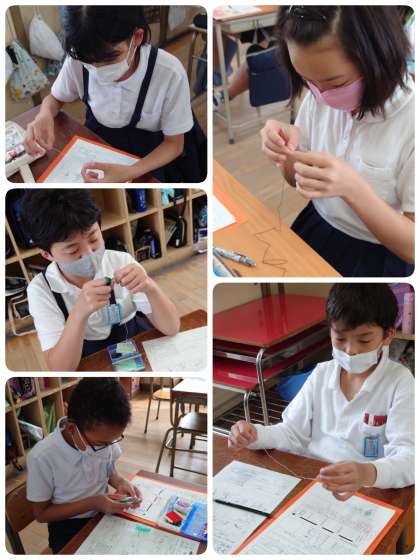 5年生は、家庭の学習にはじめてのソーイング。初めに糸の長さの決め方、糸の切り方を学びました。次に針に糸を通し、玉結びと玉どめに挑戦。糸を通すときの子ども達の表情は真剣そのもの。すっと通った時にほっとしたような笑顔でした。何でも一生けんめいに取り組む子ども達です。