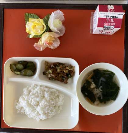 今日の献立はホイコーロー、鶏肉と野菜の中華スープ、きゅうりのピリ辛あえ、ごはん、牛乳でした。