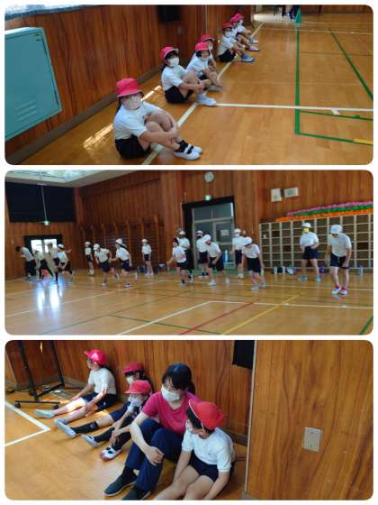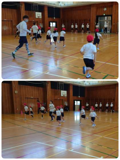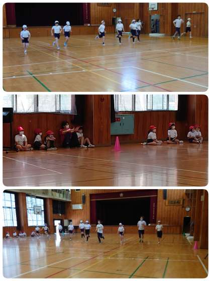 次のシャトルランは、まず1・2年生が走りました。6年生が回数を数えながら、優しい目で見守っていました。6年生が走るときは、1・2年生が「がんばれ〜!!」とずっと応援していました。