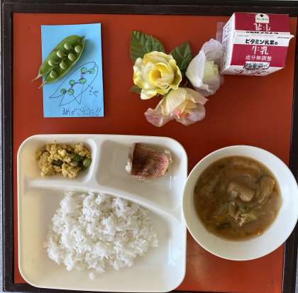 今日の献立は、あかうおのしょうゆだれかけ、みそ汁、えんどうの卵とじ、ごはん、牛乳でした。