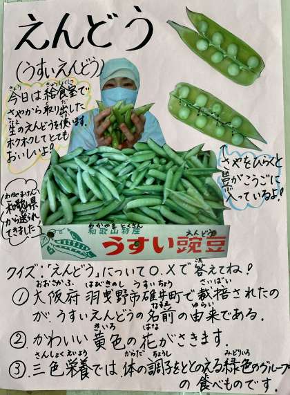 今日の給食のえんどうは、給食室でさやから豆を取り出して調理しています。