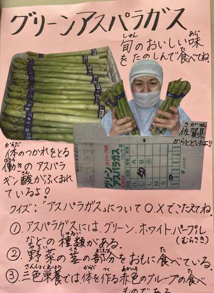 クイズの答えは、1番〇、2番〇、3番×です。アスパラガスは、体の調子を整える緑のグループの食べ物です。