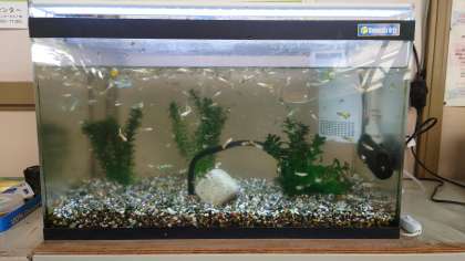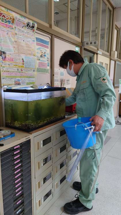 管理作業員さんが、定期的にグッピーの水槽の掃除をしてくれます。水槽に苔がうっすらついてきたら、きれいにこすって、水を入れ替えます。
