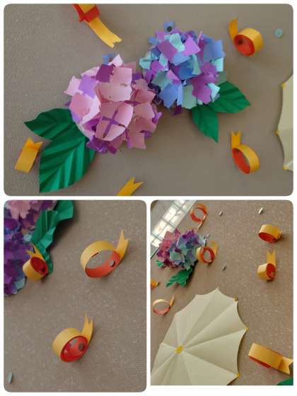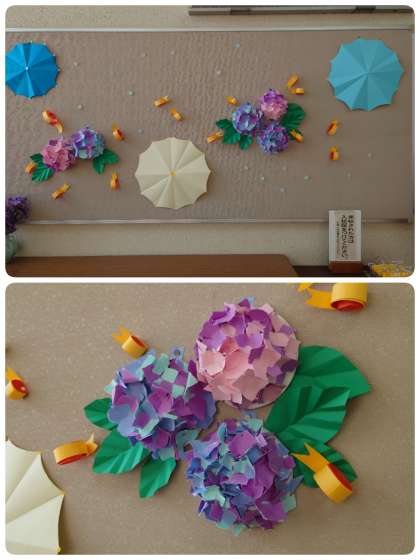 玄関掲示が6月バージョンに変わりました。立体的なアジサイと傘とカタツムリ。小さなアジサイの花がいっぱい集まって大きなアジサイになっています。なかなかステキな作品に仕上がっています。