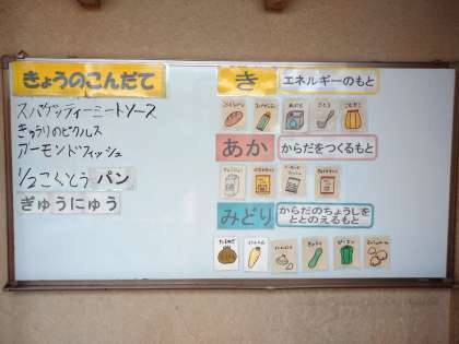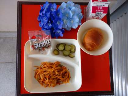 今日の献立は、スパゲッティミートソース、きゅうりのピクルス、アーモンドフィッシュ、1/2黒糖パン、牛乳でした。ピクルスは、ヨーロッパやアメリカなどで昔から作られている酢を使った野菜のつけ物です。今日の給食では、きゅうりを砂糖、塩、ワインビネガー、うすくちしょうゆで作った液につけています。きゅうりの歯ごたえも良く、大好評でした。