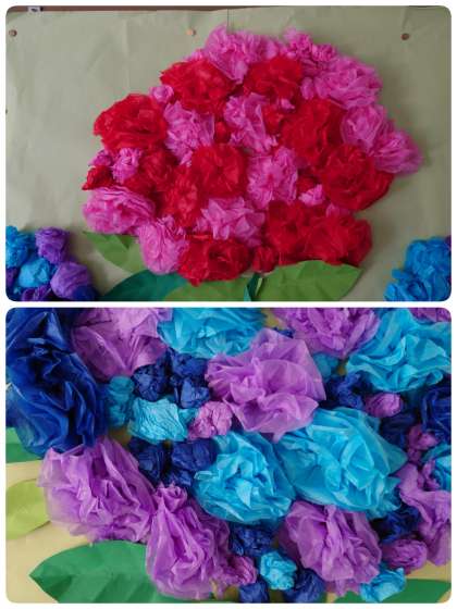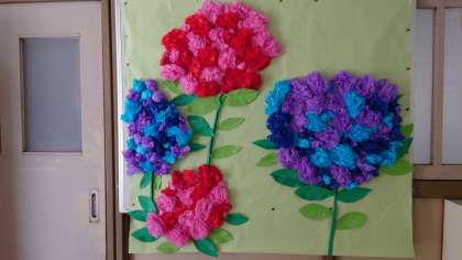 なかよしタイムにみんなで作った6月の掲示は「あじさい」です。きれいな色のおはながみをクシュクシュッとして台紙に貼りました。上手にできたでしょ。