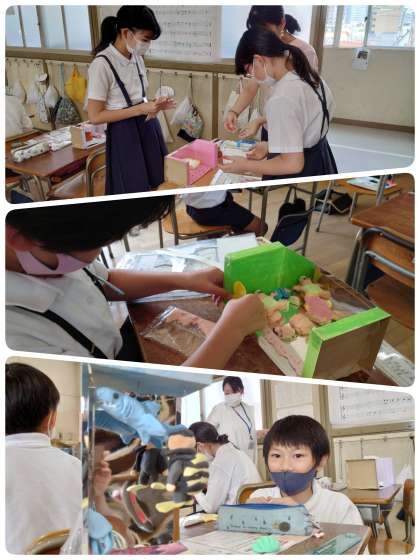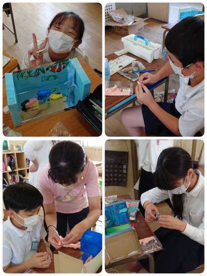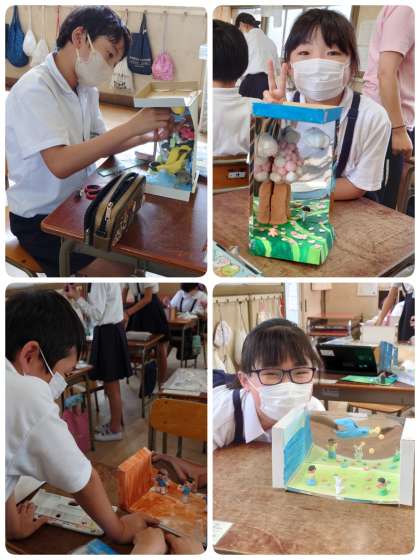 鏡の特長を活かした立体作品を作っています。鏡は、安全な紙製のミラーシートを使っています。子ども達は、自分のイメージした世界になるように、軽量の紙粘土でいろいろな物を考えながら作っています。鏡にうつった作品は空間が広がって、いろんな角度から見るとおもしろいです。子ども達はとっても楽しそうに作品づくりに励んでいます。