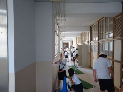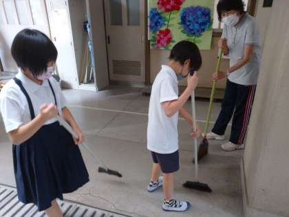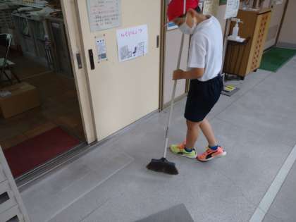 今日は、校内クリーンアップ作戦で、たてわり清掃をしています。協力して掃除できました。