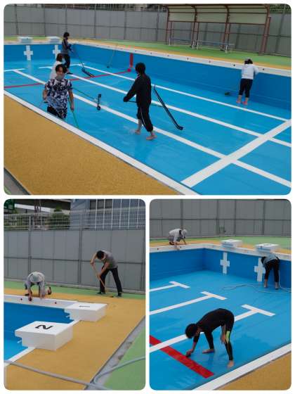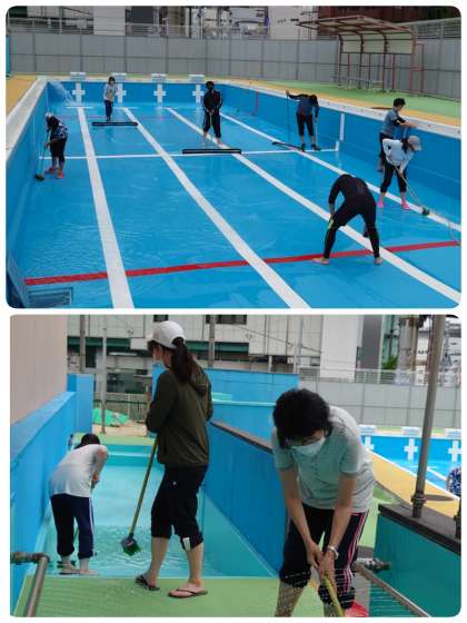 来週のプール開きに向けて、先生達がプール清掃をしました。子ども達が気持ちよく水泳学習ができるように、先生達はがんばってお掃除していました。おかげですっかりきれいになりました。後は晴れてくれるとうれしいですね。