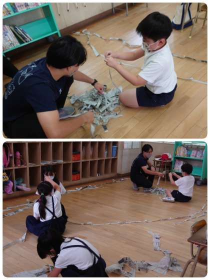 図画工作科の「新聞紙となかよし」の学習をしていました。新聞紙をできるだけ細く長くちぎっていきます。教室の端から端まで行くぐらい、途中で切れないようにちぎっていました。とっても楽しそうに遊んでいましたよ。