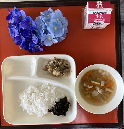 今日の給食では、のり、かつおぶし、しいたけをみりん、こいくちしょうゆなどの調味料で煮詰めて作っています。ごはんがすすみ、大好評でした。