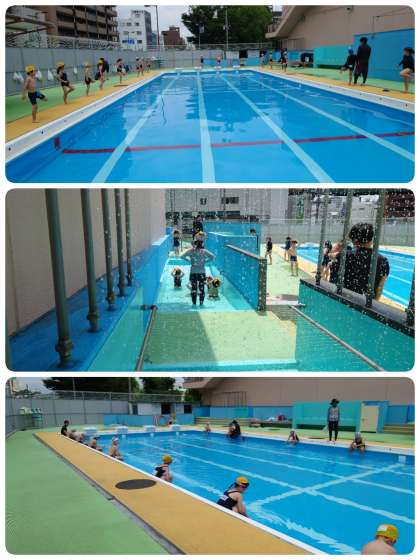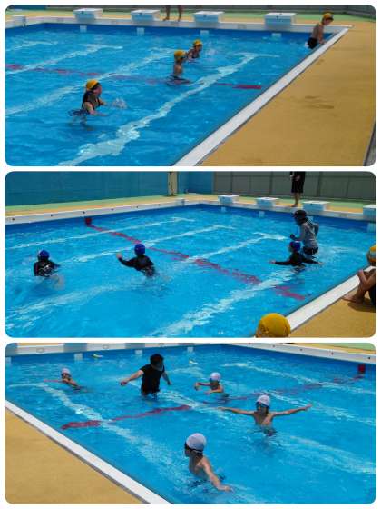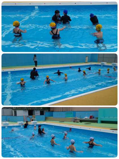 みんな先生のお話をしっかり聞いていました。ハンドサインとプールに入る順番も教えてもらいました。プールに入ってから、ひょっこりひょうたん島の曲に合わせて水慣れをしました。歩いたり走ったりしてたくさん遊びました。とっても楽しそうに学習していました。