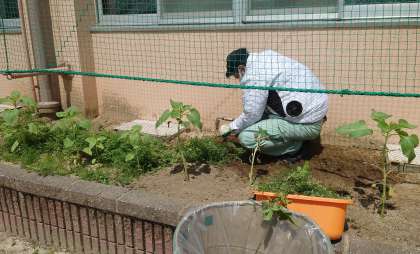 この暑い中、管理作業員さんが、講堂横の植え込みの草抜きをしてくれました。ここには去年に引き続き、地域の方が下さったヒマワリの種をまき、なかよし学級の子ども達が毎日水やりをしています。夏休みのころにはヒマワリの花がずらっと並ぶと思います。