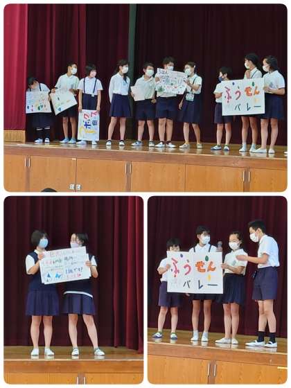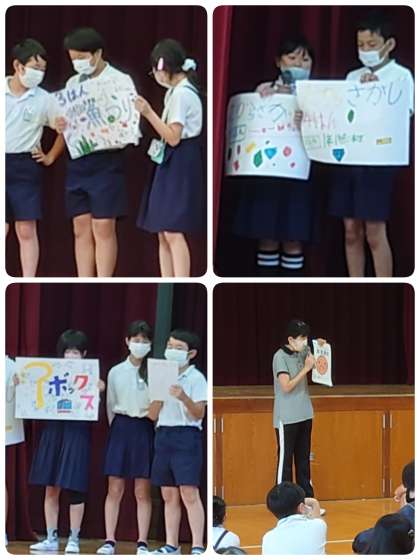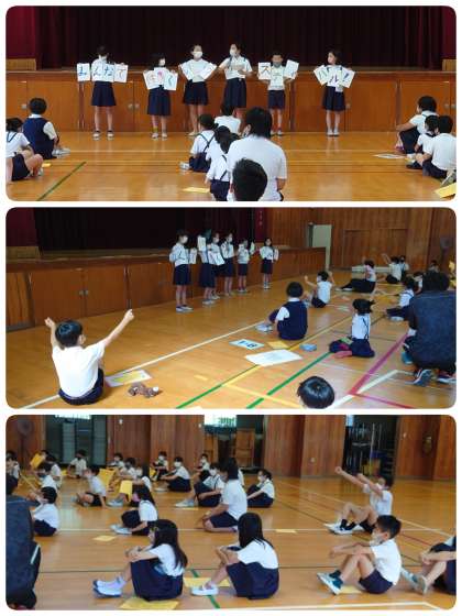 今日の児童集会は、7月2日(土)に実施する「九条東フェスティバル」のめあての発表とお店の紹介でした。