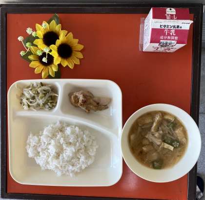 今日の献立は、鶏肉のしょうゆまヨネーズ焼き、とうがんのみそ汁、切干しだいこんのゆずの香あえ、ごはん、牛乳でした。