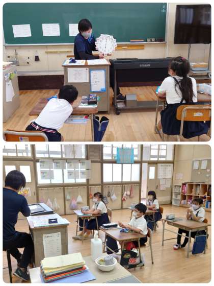 2年生が時計を使って、時こくと時間の学習をしていました。午前や午後の学習もします。先生が時計を動かしながら、次々と質問をしていました。スラスラ言えるようになりますように!!