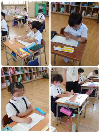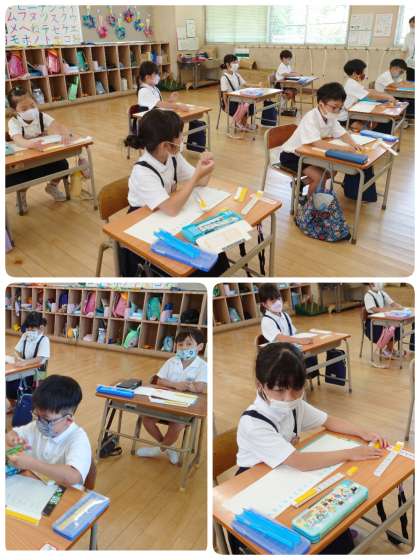 今日の算数の問題は、「はさみが 8ほん、えんぴつが 6ぽん あります。どちらが なんぼん おおいですか。」でした。ブロックを使って考え、ノートには○図を描きました。はさみの○と鉛筆の○を線でつないでいくと違いが分かります。ずいぶん慣れてきたようで、スムーズに学習が進んでいきました。