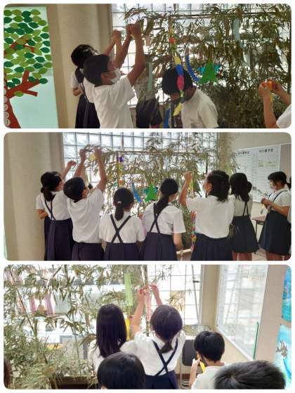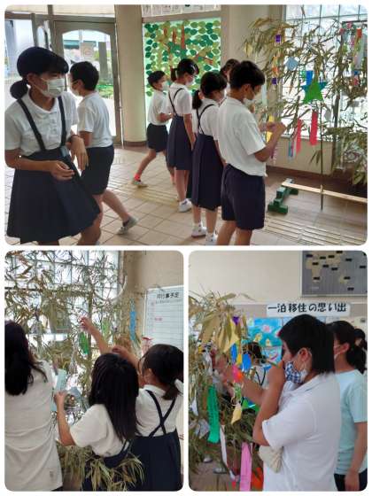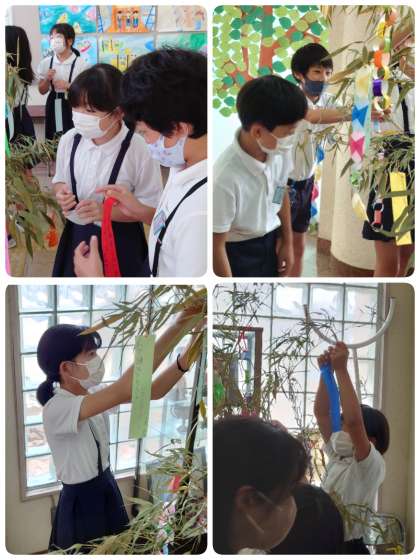 玄関に笹を立てて、子ども達が飾りや願いごとを書いた短冊をつけられるようにしてもらっています。学年で飾りつけをすると、見る見るうちに賑やかになりました。季節感が出てとってもステキです。