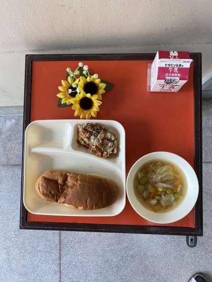 今日の献立は、かぼちゃのミートグラタン、スープ、ぶどうゼリー、黒糖パン、牛乳でした。