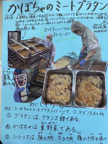 今日のクイズの答えは1番〇、2番〇、3番×です。かぼちゃのミートグラタンに入っているのは、豚ひき肉、牛ひき肉の2種類です。