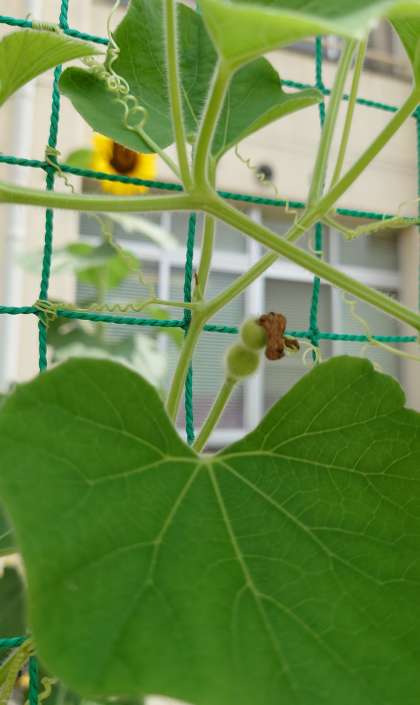 ヒョウタンの雌花の下の方が少し膨らんできた気がします。うまく受粉できなくて枯れてしまった雌花がいくつかあったので、毎日観察しています。子どもの数より少しでもたくさんヒョウタンができますように!