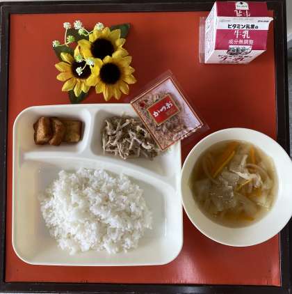 今日の献立は、豚肉ともやしのいためもの、すまし汁、あつあげのしょうがじょうゆかけ、ごはん、牛乳でした。