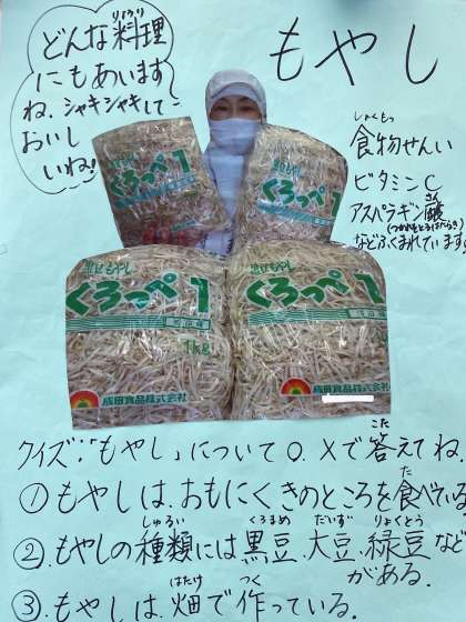 今日のクイズの答えは1番〇、2番〇、3番×です。もやしは畑ではなく、豆を水につけて、温かくて暗いところに置いて発芽させます。