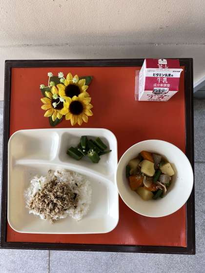 今日の献立は、豚肉とじゃがいもの煮もの、オクラの梅風味、ツナっ葉いため、ごはん、牛乳でした。