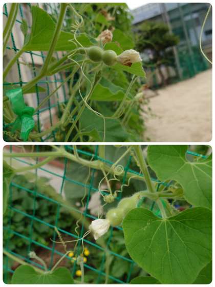この間紹介したヒョウタンが、日に日に大きくなってきています。雌花の数もどんどん増えてきているので、今日も何個か受粉しました。毎日の観察が楽しみです。