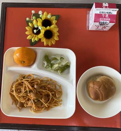 今日の献立は、チキントマトスパゲティ、グリーンアスパラガスとキャベツのサラダ、みかん(冷凍)1/2黒糖パン、牛乳でした。