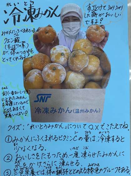 今日のクイズの答えは1番×、2番〇、3番〇です。みかんは冷凍してもビタミンCの量(100gで35mgのビタミンCが含まれている。)はほとんど変わりません。