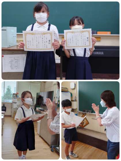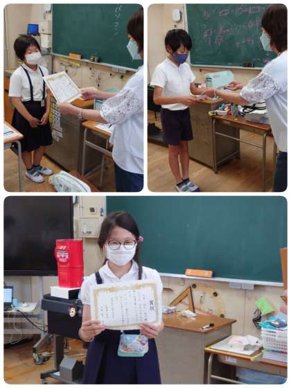 最後に、各学年で今学期1番たくさん本を読んだ人を紹介しました。終業式が終わってから、各教室に賞状を渡しに行きました。クラスのみんなからたくさん拍手をもらってにこにこの笑顔でした。