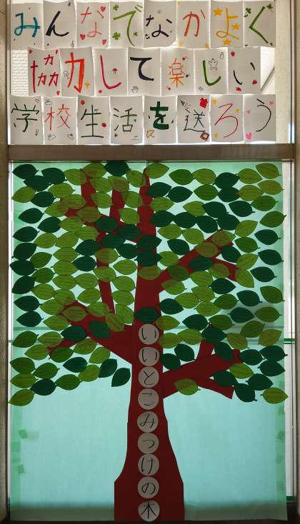 1学期に取り組んできた「いいとこみつけの木」。2本目もこんなにいっぱいの葉っぱが茂っています。1枚1枚に思いが込められた子ども達のあたたかいメッセージは、互いの心に届いているようです。(*^-^*)