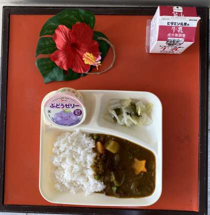 今日の献立は、ビーフカレーライス、野菜のピクルス、ぶどうゼリー、牛乳でした。
