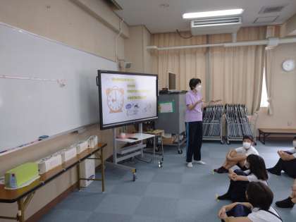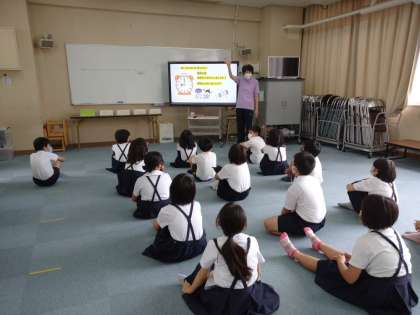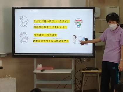 発育測定の前に生活習慣のお話や熱中症、コロナ感染予防のお話を聞きました。
