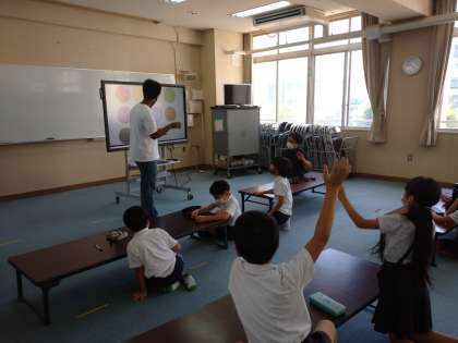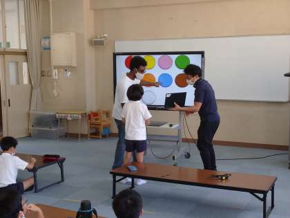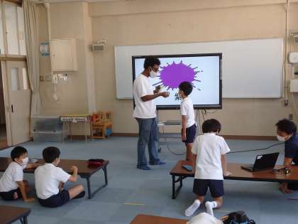 久しぶりにモリス先生と英語の学習をしました。今日は色の名前を学習し、みんな積極的に手を挙げて答えていました。